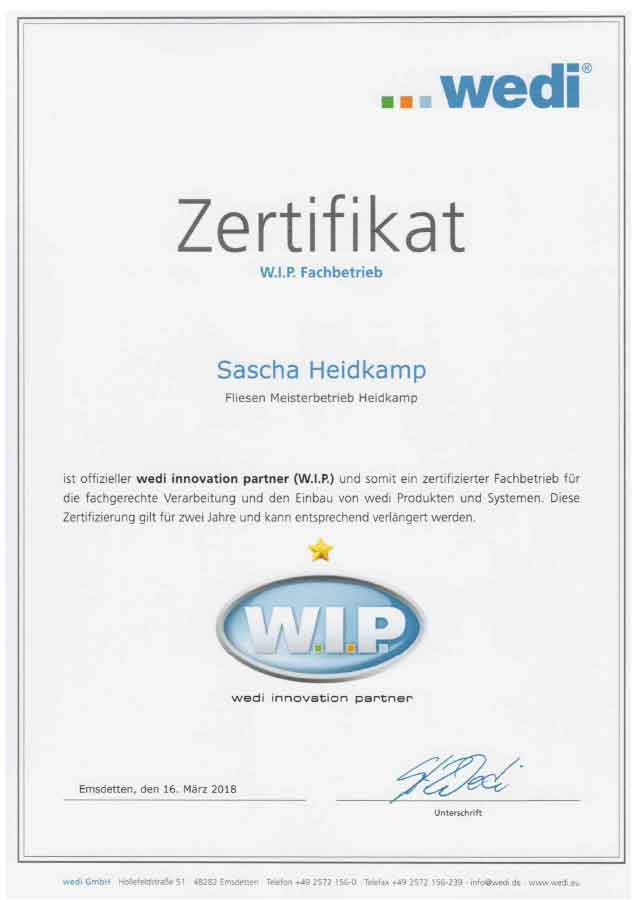 Da wir ein, von wedi autorisierter, qualifizierter und zertifizierter Fachbetrieb sind, können wir uns wedi Innovation Partner (wedi W.I.P.) nennen. Diese Partnerschaft erlaubt uns, die wedi-Systemgarantie anzubieten, welche zugleich eine verlängerte Garantieleistung von zehn Jahren beinhaltet.